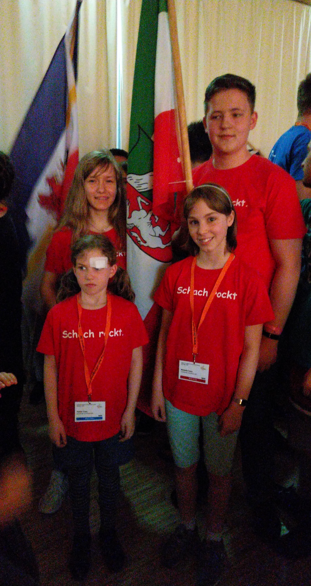 Am Anreisetag fand wie jedes Jahr die Eröffnungsfeier statt, ein Highlight dabei ist der Einlauf der Delegationen mit den Landesfahnen. Fahnenträger dieses Jahr waren Jonas Gallasch, Luisa Bashylina, Michelle Trunz und Tamila Trunz. Außerdem wurden die Spieler des Jahres 2018 geehrt, für die man im Vorhinein im Internet abstimmen konnte. In der Kategorie u14 weiblich war dieses Jahr WCM Luisa Bashylina aus NRW nominiert. Sie holte im letzten Jahr in der u12w mit der Mannschaft die Goldmedaille und im Einzel die Silbermedaille bei der Jugendeuropameisterschaft. Die Wahl war die knappste aller Zeiten, mit nur einer Stimme mehr setzte sich leider Antonia Ziegenfuß gegen Luisa durch. Die Kategorie u20 weiblich gewann WIM Annmarie Mütsch, die 2018 Weltmeisterin in der u16w wurde. In der u20 männlich gewann IM Luis Engel. Die Kategorie u14 männlich gewann IM Vincent Keymer, der seit seinem Tuniersieg beim GRENKE Chess Open 2018 in aller Munde ist. Morgen kommentiert Vincent die Partien der DEM, die Livekommentation startet 30 Minuten nach Rundenbeginn, ihr findet sie hier: https://www.youtube.com/user/ChessyTV